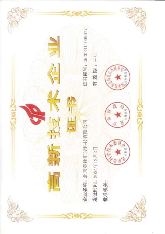 北京英途汇骏科技有限公司2024年成为北京高新技术企业,多年来深耕金融行业,拥有丰富的技术经验和专业服务能力,持续为大型金融机构提供高效、安全的数据集成解决方案。目前成功服务于包括中国邮政集团、中国邮政储蓄银行、渤海银行等在内的数十家金融行业领军企业。 未来,我们将持续聚焦金融行业数字化转型需求,以更智能的数据技术赋能业务创新,与客户共同探索数据驱动的新增长模式。 高新证书