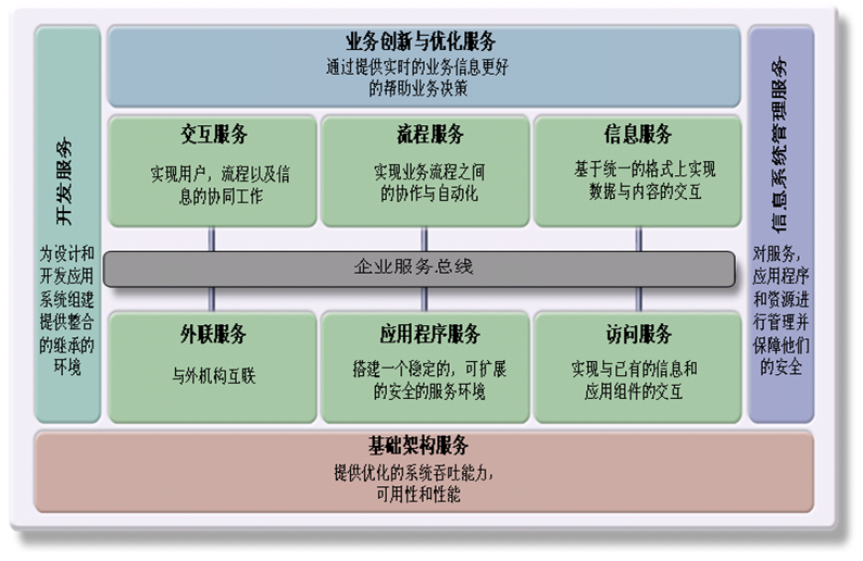 ESB是实现SOA思想的一个软件基础结构: 由一系列用于连接Services的interaction points组成。 一个Services 能够调用已经连接到Bus上的其他的 services。 不用改变Service消费者和提供者,允许它们在调用时通过动态的、柔韧的连接性实现交互。所有的交互是可管理和可度量的。 通过最小化Services之间明确的连接性来简化SOA。 |